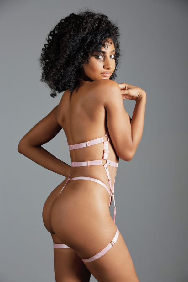 Claire 2 piece set creates a doll-esque look with its straps circling and celebrating each and every curve. Wild & deliciously beguiling. Adjustable straps throughout.