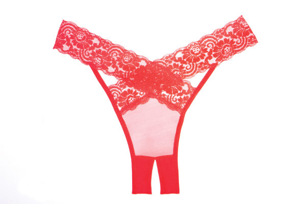 Fantasy follows where rumors go in this sinfully erotic crotchless panty, with a sneaky ouverte back. Delicate lace kisses both the front and back, and is topped all around by a band of sheer mesh.