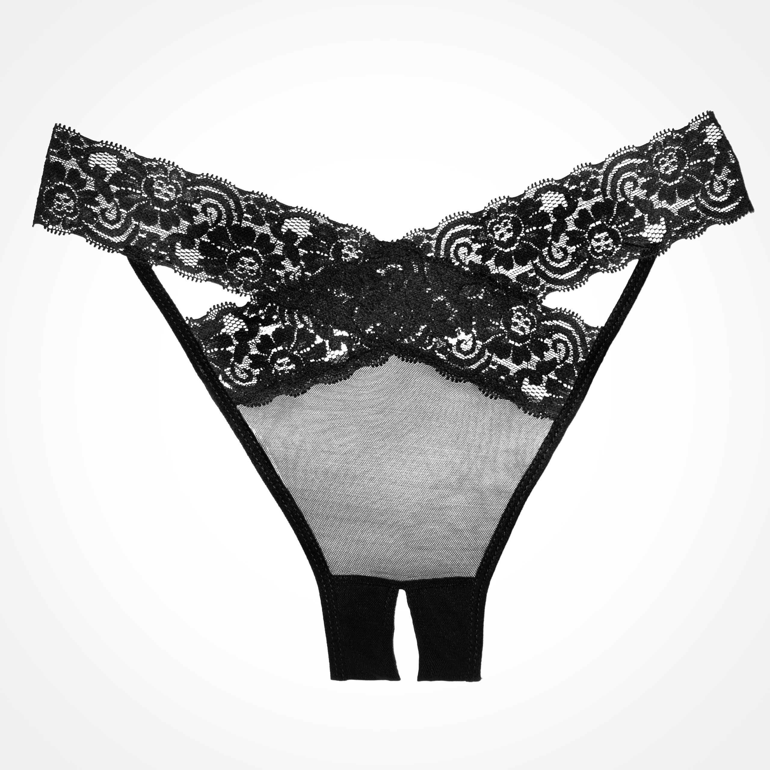 Hidden desires revealed in this seemingly secretive sheer mesh crotchless panty, with eyelash lace caressing the ouverte derriere. That it is topped with a bow is a wink of sweet, sprinkled over a flow of naughty.