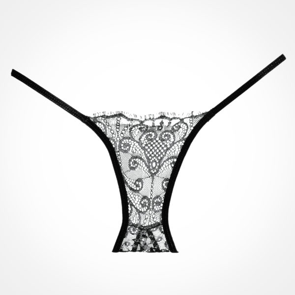 Fantasy follows where rumors go in this sinfully erotic crotchless panty, with a sneaky ouverte back. Delicate lace kisses both the front and back, and is topped all around by a band of sheer mesh.